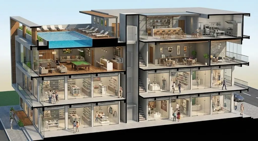 A G+3 multi-level destination at the estate entrance, serving as the commercial and social anchor.
